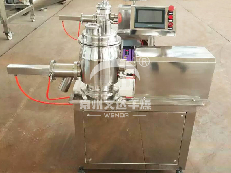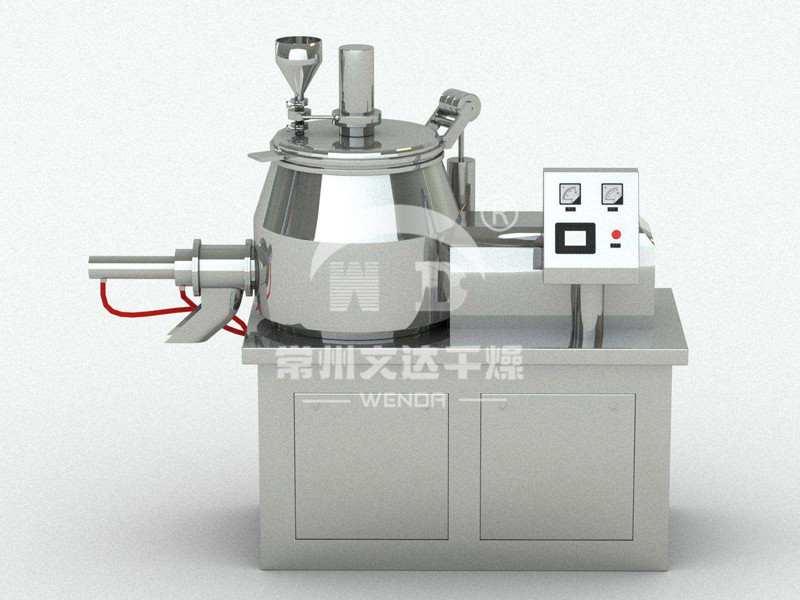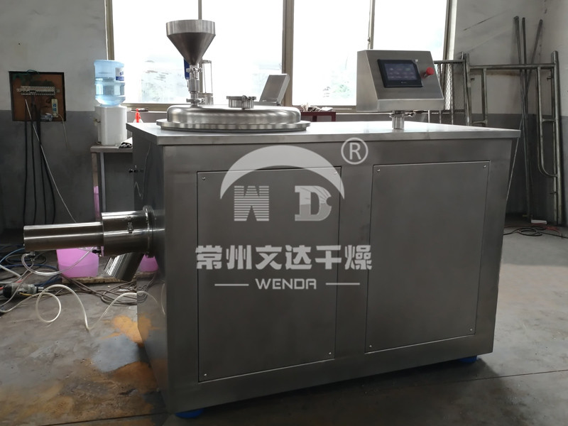 粉體(ti)物料與粘(zhan)合(he)劑在(zai)圓(yuan)筒形容器(qi)中由底部混合(he)漿充分混合(he)成濕潤(run)軟材(cai),然后由側置的高(gao)速粉碎槳切(qie)割成均勻(yun)的濕顆粒。