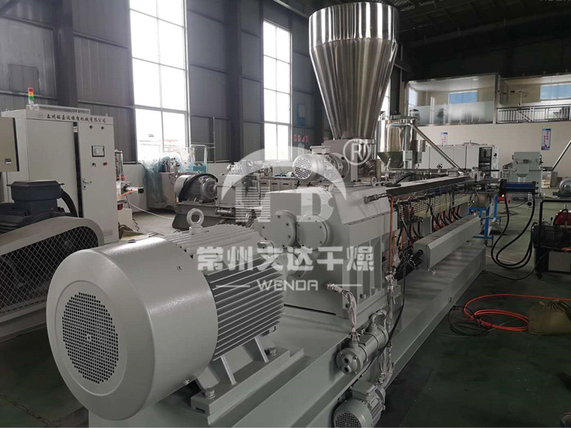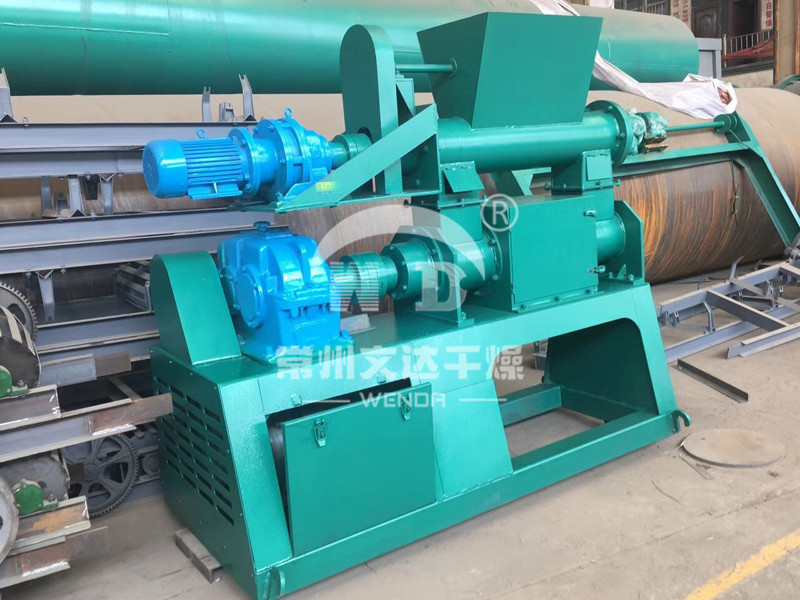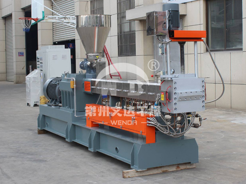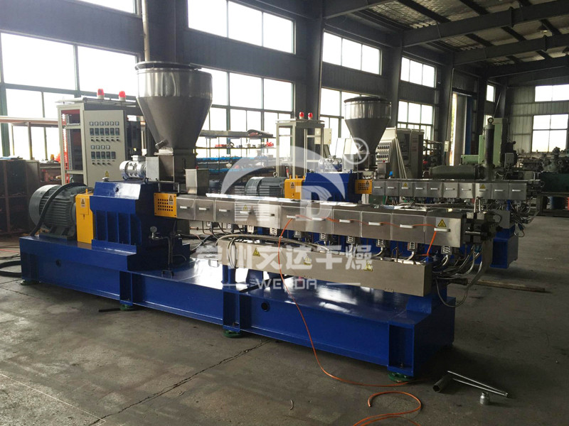 螺桿擠出造粒機為雙螺桿,其擠出形式有前擠出和側擠出二種機型。由驅動、減速、傳動箱及主機等部分組成,加入主機內的濕粉狀物料,在特殊設計的螺桿元件作用 下經輸送壓實,開壓不均壓過程,被送至造粒機頭,并被擠出模板,形成同柱狀的顆粒產品,從而達到造粒目的。由于粉狀物料是在濕態下完成擠出制粒過程,使得 后續操作過程(如:干燥、包衣等)及操作條件得到大大改善。一般可減少現場粉塵量90%以上。