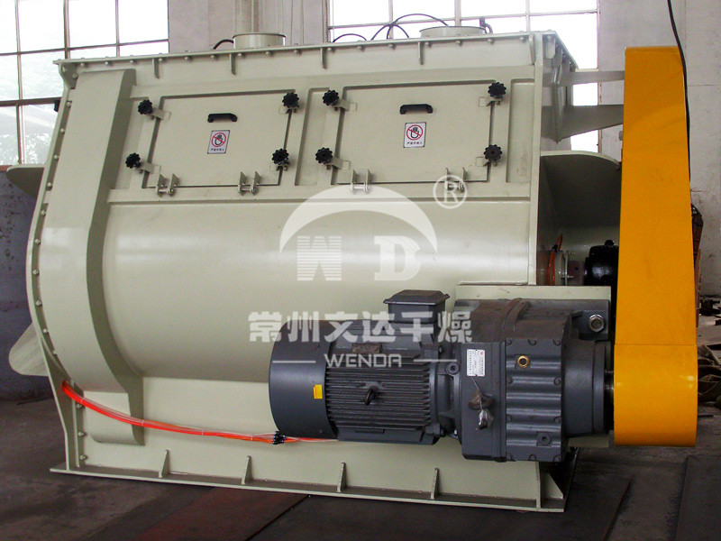 本系列混合機以強烈、高效混合為特點、臥式筒體內兩根攪拌等速反向旋轉,上特殊布置的槳葉確保物料徑向、環向、軸向三向運動,形成復合循環,在極短的時間內達到均勻混合。