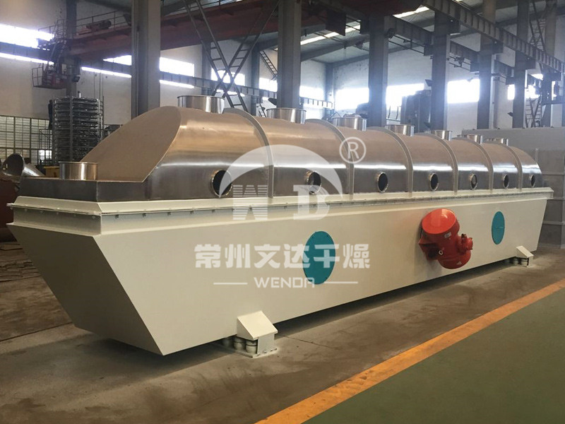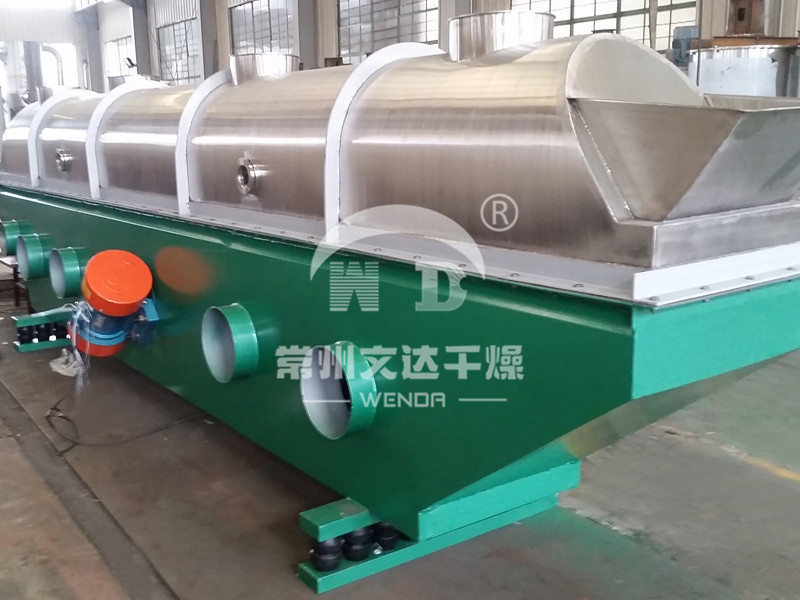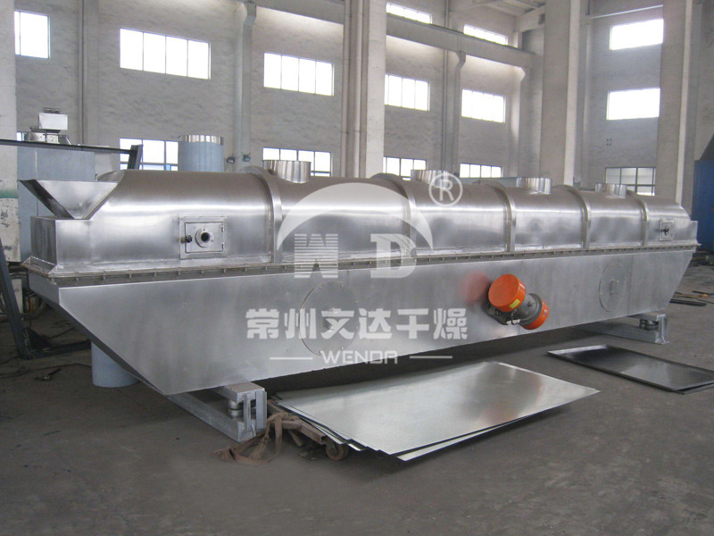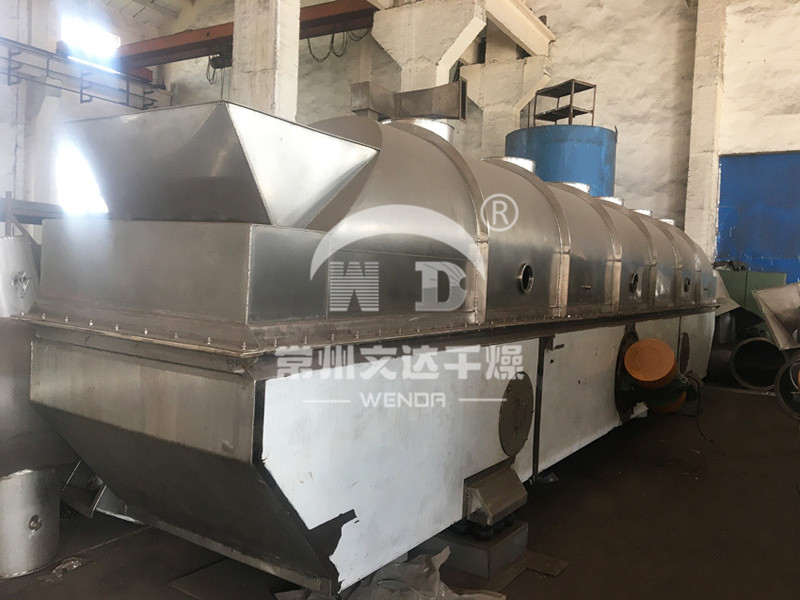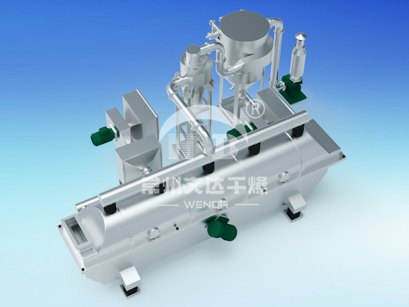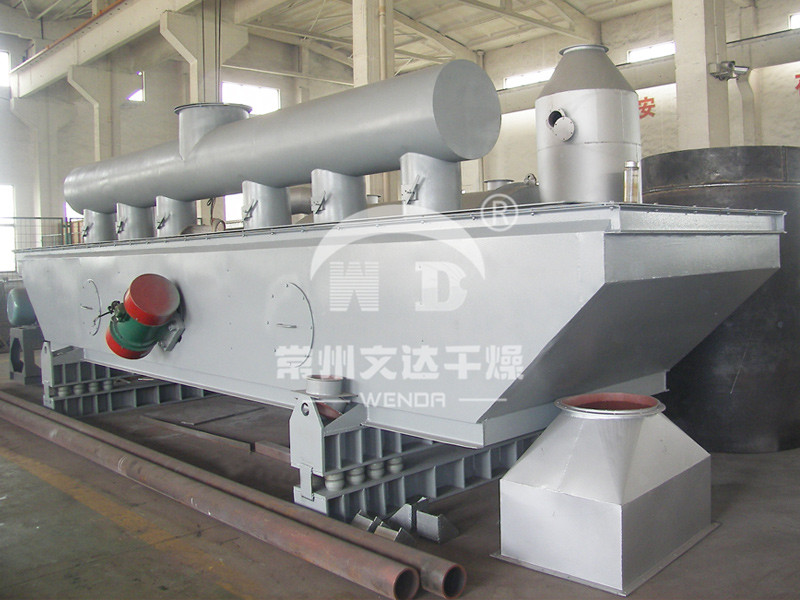 物料自進料進口進入機內,在振動力作用下,物料沿水平面流化床拋擲,向前連續運動,熱風向上穿過流化床同濕物料換熱后,濕空氣經旋風分離器除塵后由排風1:3排出,干燥物料由排料進口排出。