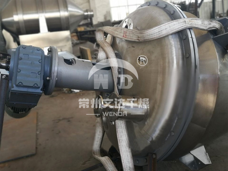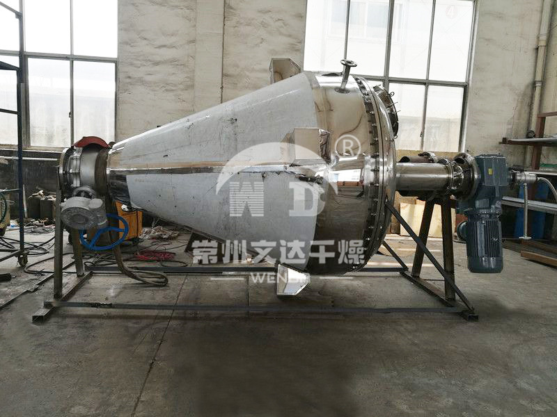 三合(he)(he)一(yi)單(dan)錐(zhui)螺帶(dai)(dai)錐(zhui)形真空(kong)干(gan)(gan)燥(zao)機(ji)是(shi)一(yi)種利(li)用螺帶(dai)(dai)將(jiang)物(wu)(wu)料旋(xuan)轉提升及(ji)圓錐(zhui)夾套、空(kong)心螺帶(dai)(dai)內(nei)同時通(tong)入(ru)傳熱(re)介質(如(ru)熱(re)水、導熱(re)油(you)、蒸汽(qi)等),使加熱(re)后物(wu)(wu)料從四(si)周提升并(bing)從中間下落,快速不(bu)斷的(de)(de)循(xun)環翻(fan)轉,并(bing)通(tong)過筒體內(nei)抽(chou)真空(kong)將(jiang)水汽(qi)及(ji)時帶(dai)(dai)走, 使物(wu)(wu)料在(zai)短時間內(nei)達到干(gan)(gan)燥(zao)和混(hun)合(he)(he)目的(de)(de)。與傳統的(de)(de)立式混(hun)合(he)(he)機(ji)相比,筒體內(nei)無任何傳動機(ji)構,從根本上杜絕因(yin)潤滑油(you)泄漏而導致物(wu)(wu)料污染(ran),運(yun)行可靠穩(wen)定,特別(bie)適宜衛(wei)生要求高(gao)的(de)(de)粉料、顆(ke)粒混(hun)合(he)(he);同時也適用于粘性流體或稠狀、濕狀為主物(wu)(wu)料的(de)(de)攪拌混(hun)合(he)(he);與其它(ta)臥式干(gan)(gan)燥(zao)機(ji)相比,具(ju)有出(chu)料方(fang)便,可以100%完全出(chu)料,操作、維修方(fang)便。它(ta)的(de)(de)干(gan)(gan)燥(zao)效率是(shi)同等規格(ge)“雙錐(zhui)回轉真空(kong)干(gan)(gan)燥(zao)機(ji)”3-5倍(bei)。